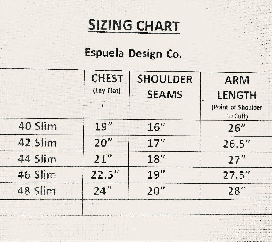 This jacket is a slim fit with nice long arms and fits the same as our 8 seconds sport coat and red foil sport coat exclusively by Espuela Design Co.