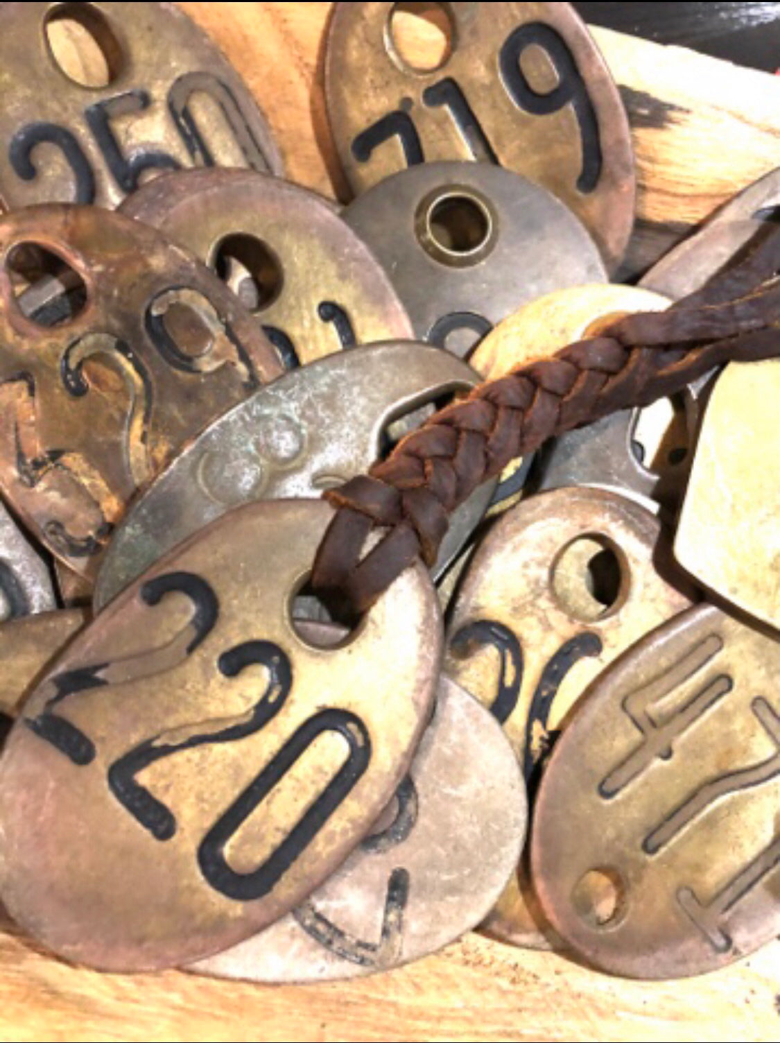 Vintage brass dairy cow tag, hand braided onto your bag with matching leather.